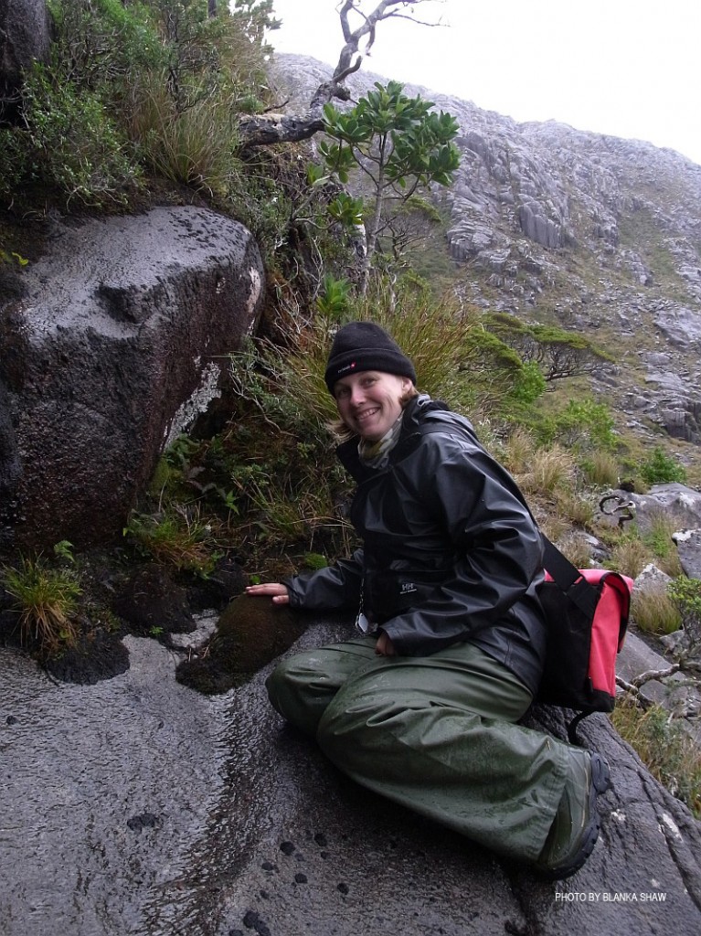 As Kimmy and I were working our way down the ravine, she told me that prior to our trip she had been tending toward going into entomology in graduate school but now was more interested in mosses! It’s always great to get a new convert! I had been interested in insects as an undergrad, too, so I was certainly sympathetic to such a career. However, neither of us were comfortable killing so many insects and how it was okay to kill invertebrates but somehow vertebrates were different. For me no one species is inherently “better” than any other and so the evolutionary addition of a backbone shouldn’t determine if it is acceptable to kill another species. (We were the only two vegetarians on the trip, and that may have had something to do with our common concerns.) I even feel this way about plants and although I collect (and thus kill) many mosses, if I pick up a moss and decide not to keep it, I always try to replace it, as a kind of good karma. I figure collecting a moss means that although it will die, it does so to enrich the heritage of The New York Botanical Garden! After working through the ravine we were both pretty wet and muddy and decided to call it a day. It was also so overcast that, even though the sun wouldn’t set for another three hours or so, the low light made it hard to see (not to mention the continuous rain on my hand lens).