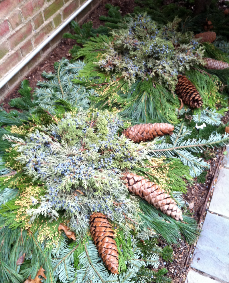 Hiburnal moments abound throughout the Garden as well. A decorative display adorns the mixed borders by the entrance of the Catering office at the old Café, with variegated and green hollies forming the backdrop. The display is composed of seasonal boughs—pine, fir, incense cedar and juniper stems laden with berries. The boughs are artistically arranged and secured to the soil with landscape pins, while large pine cones complete the design, which brightens up borders and lasts throughout the holiday season.
