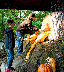 Last weekend was our Pumpkin Carving Weekend with Ray Villafane, and the Master Carver himself executed a massive pumpkin sculpture, after his own design, with the help of his crack team. The fruits—or gourds—of his labor are on display through October 31 as part of The Haunted Pumpkin Garden.