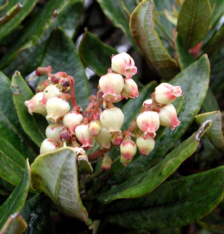 Photographs by R. E. Halling © 2003 This member of the Ericaceae is responsible for forming arbutoid ectomycorrhizal associations with members of the Agaricales, Boletales, and Russulales. The roots of the plant take on a definitive morphology and anatomy. Above timberline, in the páramo zone of the Talamancas, the plant can form extensive thickets, or in some sites, semi-open mono-dominant stands occur (at left). A complete description of, and distinction between, the 2 subspecies can be found at J. Luteyn's Neotropical Blueberries site. Both subspecies are shown below and can be distinguished by the presence (subsp. arbutoides) or absence (subsp. costaricensis) of a rusty colored tomentum on the underside of the leaves.