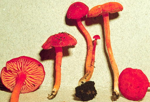 This bright orange red mushroom is common on wet mossy soil in the montane Quercus forests of Costa Rica. The pigments are quite intense in young specimens, but fade more to orange yellow tones with age.
