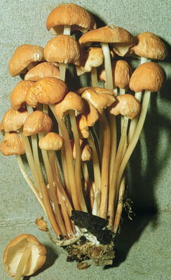 This Marasmius of sect. Sicci ser. Leonini has, on occasion, been exceedingly common in Costa Rican oak forests. We have found it in the Talamancas as well as in the volcanic cordilleras (Poas for example). The cespitose cluster seems diagnostic, as well as the glabrous stipe, subrugulose pileus, and crowded lamellae. The epithet "tropalis" refers to the cespitose/clustered habit. It seems closest to M. corrugatus var. aurantiacus described from oak bark in Florida.