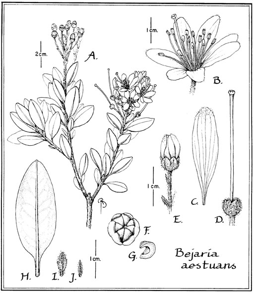 Bejaria aestuans. A: habit. B: flower. C: petal. D: calyx with style and stigma. E: flower bud. F: capsule still enclosed within calyx. G: single capsule valve. H: leaf, lower surface. I: floral bract. J: bracteole (CLEMANTS 1668). -- Reproduced with permission from The New York Botanical Garden from Flora Neotropica Monograph 66: 75, fig. 7 (1995).
