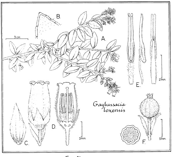 Gaylussacia loxensis. A: habit. B: close-up of leaf tip, lower surface. C: floral bract. D: flower, with longitudinal section showing position of stamen. E: stamen, front, side, and back views. F: drupe, with cross-section (HART 1338). Drawing by B. Angell.