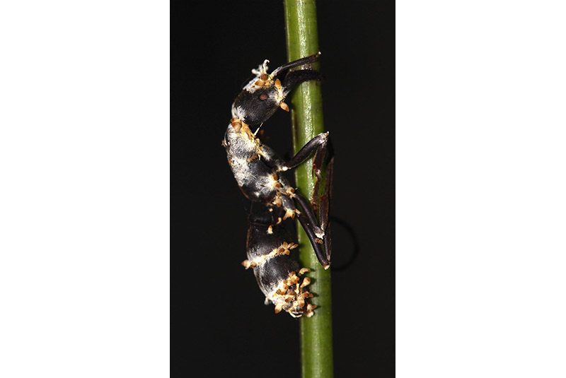The following hours are followed by dramatic changes in the ant’s behavior, including the desertion of its nest to seek out a higher location in the forest. The moribund ant is led by the fungus to climb up onto plant parts such as leaves and spines, where it will spend its last hours while the fungus consumes its organs. Once the ant has reached a proper location for the fungal development, the parasite will finally command the ant to bite tightly onto the plant that will serve as the ant’s grave. That same location will be the platform from which the fungus soon shoots its spores.